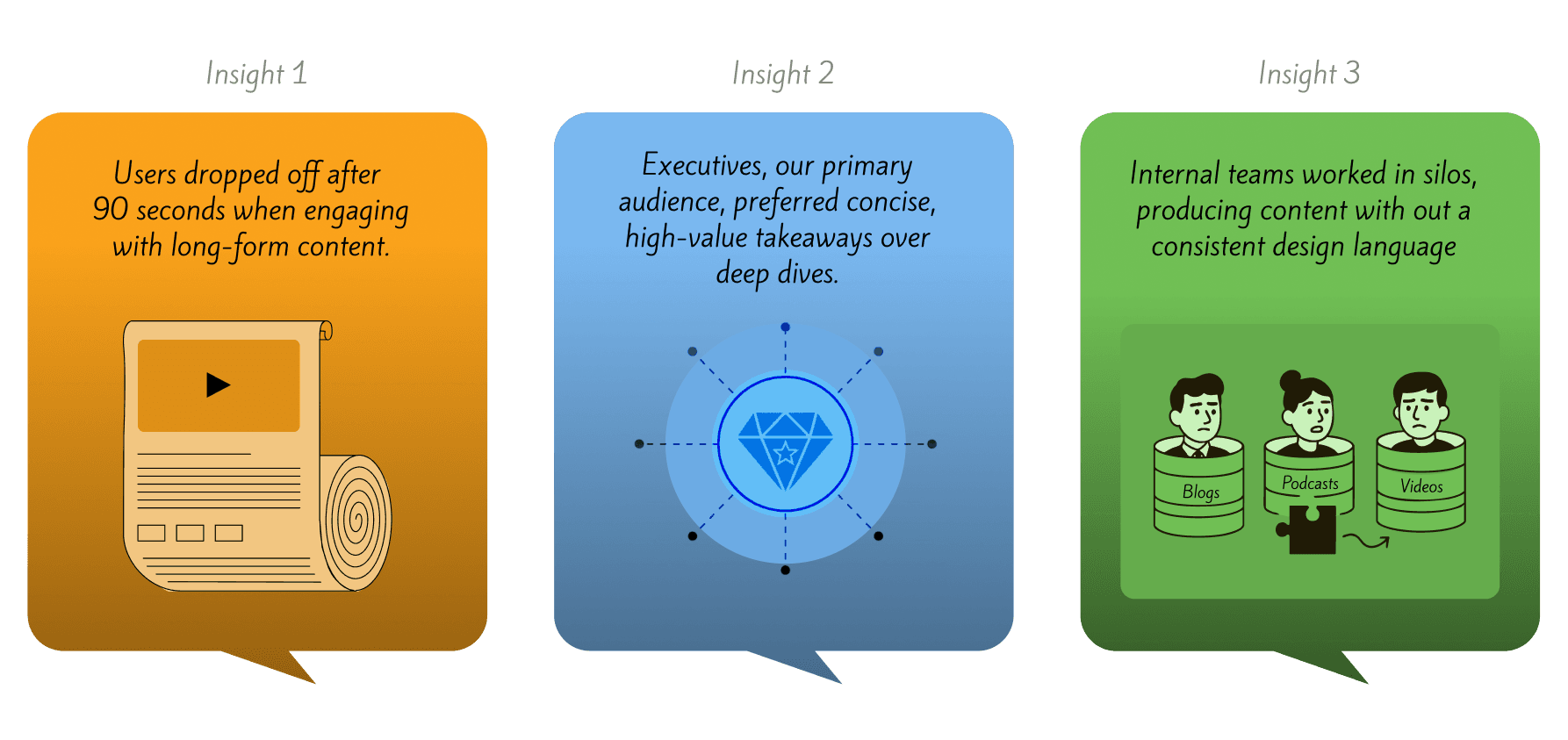Early analytics and qualitative feedback revealed key behavioral insights: Users dropped off after 90 seconds when engaging with long-form content.Executives, our primary audience, preferred concise, high-value takeaways over deep dives.Internal teams worked in silos, producing content before finalizing design structures — causing inefficiencies.