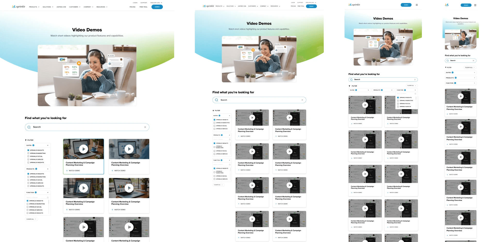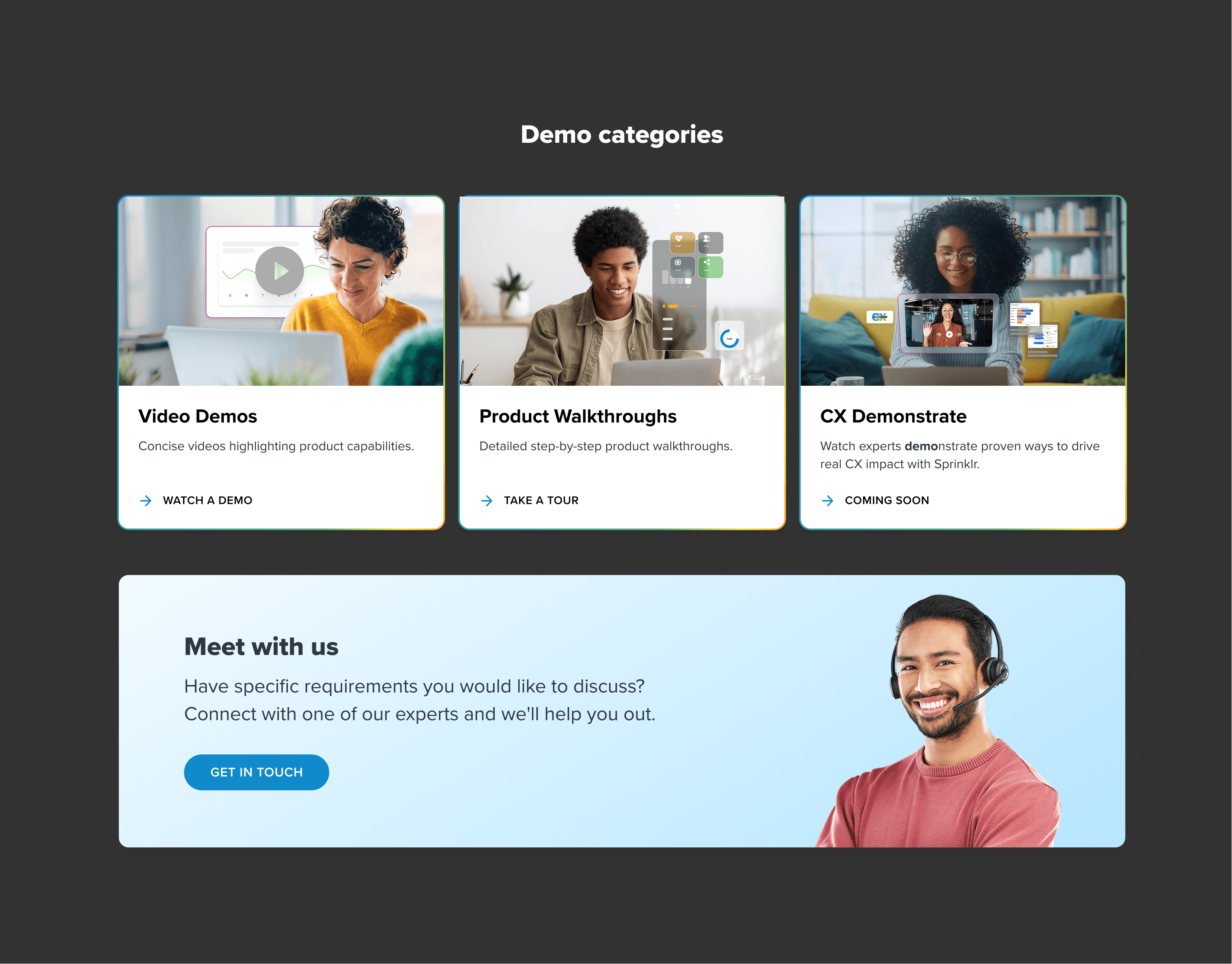 Our design process began with a critical analysis of user mindset. We quickly determined that mixing our three core content types—Video Demos (quick, passive interest), Product Walkthroughs (active, deep exploration), and CX Demonstrations (high-intent, expert-led sessions)—would be confusing. This early insight led us to reject the initial "Wall of Videos" concept, where all media were blended. We understood that a user looking for a 60-second clip had a fundamentally different need than one ready to sign up for a personal demonstration. We pivoted to a clean, card-based landing page, explicitly segmenting content by the level of commitment required.