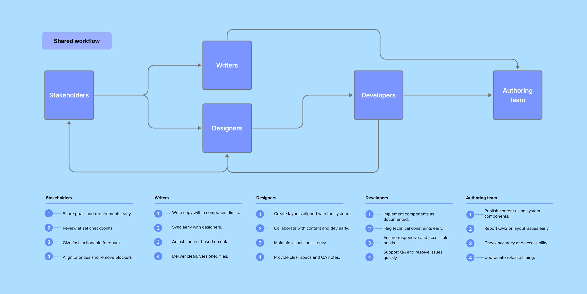 I united all moving parts — stakeholders, content writers, authors, and designers — into one shared workflow.Everyone knew their role, and visibility was transparent across stages.The result: fewer redesign cycles, faster approvals, and cleaner QA.